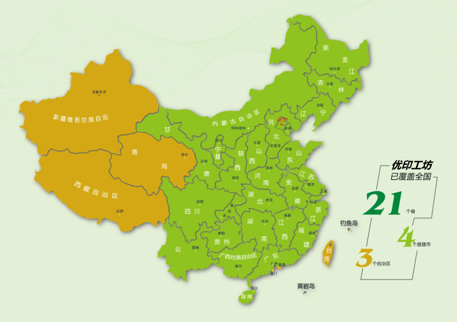 2016年優(yōu)印工坊已成功發(fā)展318家加盟店,覆蓋了冀、晉、遼、吉、黑、蘇、浙、皖、閩、贛、魯、豫、鄂、湘、粵、瓊、川、貴、云、陜、甘21個省,北京市、天津市、上海市、重慶市4個直轄市和廣西壯族自治區(qū)、內(nèi)蒙古自治區(qū)、寧夏回族自治區(qū)3個自治區(qū)。同時拓展了海外市場——非洲市場,在東非肯尼亞內(nèi)羅畢設(shè)立文件處理中心。在上海商學(xué)院建立優(yōu)印工坊實驗室,培養(yǎng)數(shù)碼印刷行業(yè)高端人才。
